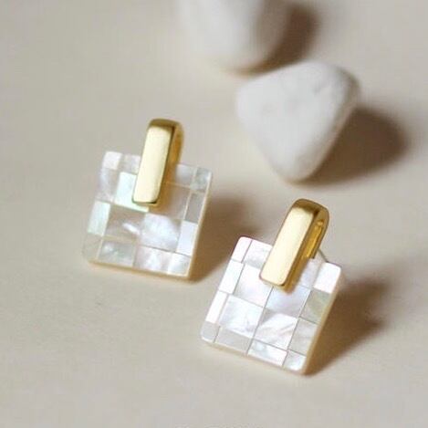 ホワイトの天然シェルがモザイクみたいに配置されたピアス。